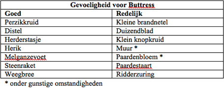In de loop van groeiseizoen is het middel Buttress toegelaten. Het is een systemisch contactherbicide. Actieve stof is 2,4 DB met 400 gr/liter. Bij opname door de plant wordt de stof omgezet in het actievere 2,4-D. Hierdoor heeft het middel een trage werking.