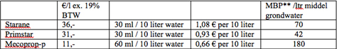 Bij het gebruik van een rugspuit zijn de middelkosten laag. En zijn er weinig milieubelastingspunten. Mecoprop zeker niet volvelds inzetten. Het geeft zowel een duidelijke groeiremming als een aanzienlijk belasting van het grondwater.