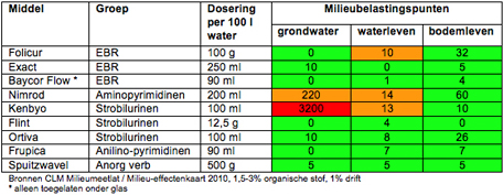 Beperk het gebruik van Nimrod op gronden met een organisch stofgehalten onder de 3%. Op gronden met een laag o.s. gehalte geeft Nimrod een hoge belasting voor het grondwater. Kenbyo geeft te allen tijde een te hoge milieubelasting voor het grondwater. Gebruik dus liever Flint of Ortiva. Dit is nog goedkoper ook!