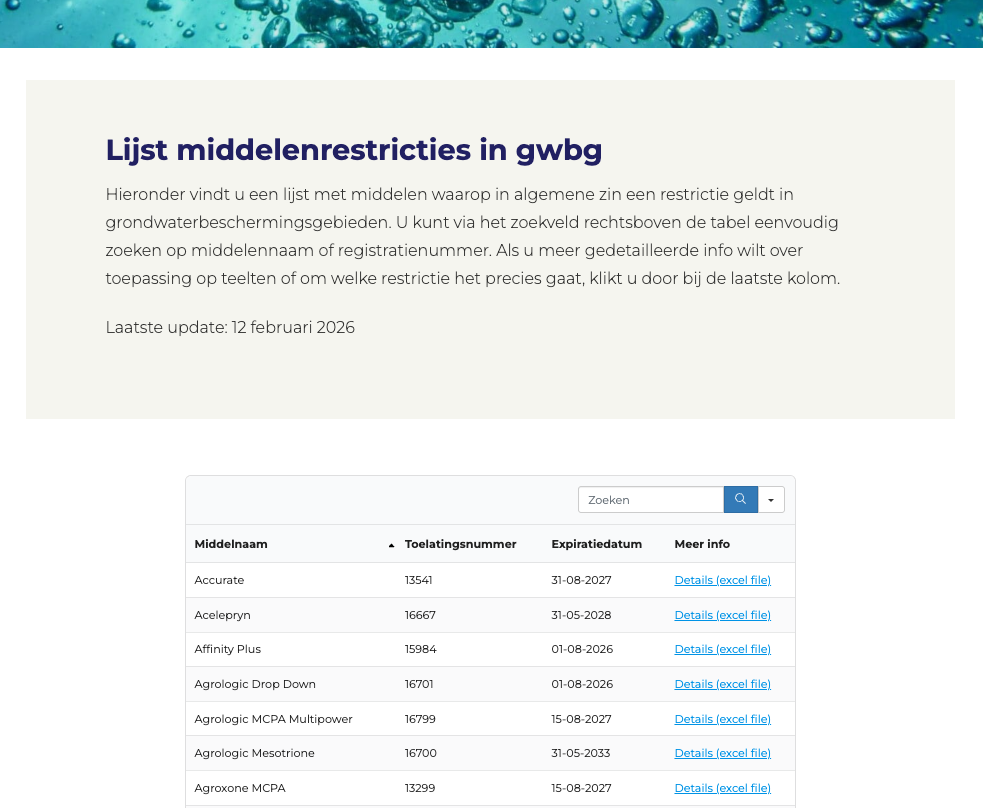 Bij het toelaten van gewasbeschermingsmiddelen schrijft het CtgB waar nodig gebruiksverboden of -beperkingen in grondwaterbeschermingsgebieden voor. Omdat een duidelijk overzicht ontbrak heeft CLM een overzicht van gewasbeschermingsmiddelen met een gedeeltelijk of volledig verbod op het gebruik in grondwaterbeschermingsmiddelen opgesteld (conform de toelating door het Ctgb). De gewasbeschermingsmiddelen staan op alfabetische volgorde en er kan gezocht worden op middelnaam en op toelatingsnummer. Daarnaast kan onder het kopje meer info de specifieke beperking worden opgezocht. Het overzicht wordt halfjaarlijks geactualiseerd.