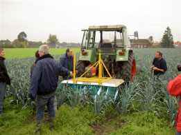 Na de machine aan het werk gezien te hebben, werd de middag afgesloten met een levendige discussie. Duidelijk werd dat de machine nog aanpassingen vraagt om geschikt te zijn voor de toepassing in prei. Prei heeft een waslaag en vraagt waarschijnlijk om een hogere dosering UV licht dan de 15-20 mj/cm2 die nu gegeven is. Ook de capaciteit van de machine moet worden vergroot om het arbeidstechnisch mogelijk te maken 2-3 keer per week de behandeling uit te voeren. Het gaat dan om een bredere machine (18 m of meer) en mogelijk een hogere rijsnelheid met een voldoende mj/cm2. Het is een must dat deze machine op tijd klaar is om in 2009 tijdig met behandelingen te starten. Er moet financiering gevonden worden om de aangepaste machine te bouwen. Kosten worden geschat op 80.000-100.000 euro. Een noodzakelijke investering want zonder een juiste machine, geen goede praktijk-proeven en zonder die proeven geen acceptatie.